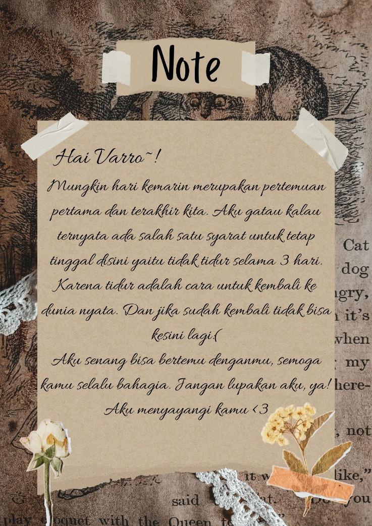 Membacanya, Varro meneteskan air mata. Jika tau begini, Varro mungkin akan lebih menikmati waktunya di dunia khayalan lebih lama lagi. Ia benar benar tidak menyangka bahwa pertemuannya dengan sosok khayalannya di masa kecil akan terasa se-singkat itu.